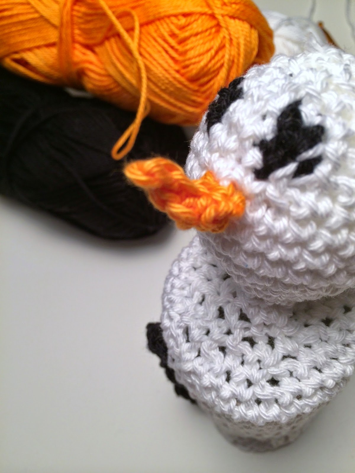 Damit das Gesicht vollständig wird, fehlt noch die Möhre...auch die ist "frei Schnauze" von mir reingehäkelt: eine Mischung aus Luftmaschen & Stäbchen, damit sie auch schön krumm und schief wird :-)