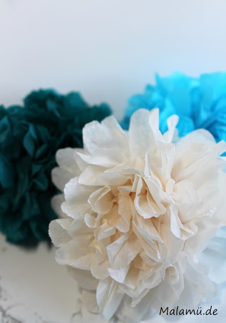 Damit nicht nur einfach die Rollen an unserem Ast hängen, hab ich aus dem restlichen Seidenpapier noch kleine Pompoms gebastelt.